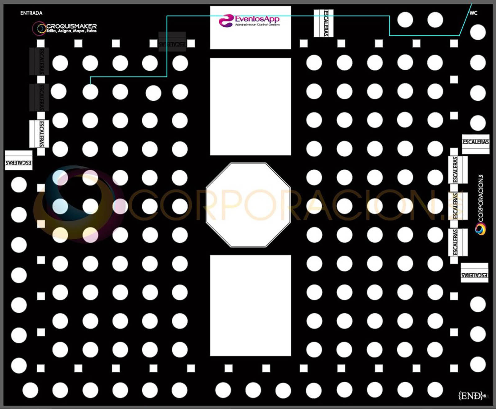 Muestra a tus invitados las diferentes rutas importantes en un evento como son llegar a la mesa en el checkin, dirigirte a las dos amenidas mas importantes area de fumar y WC